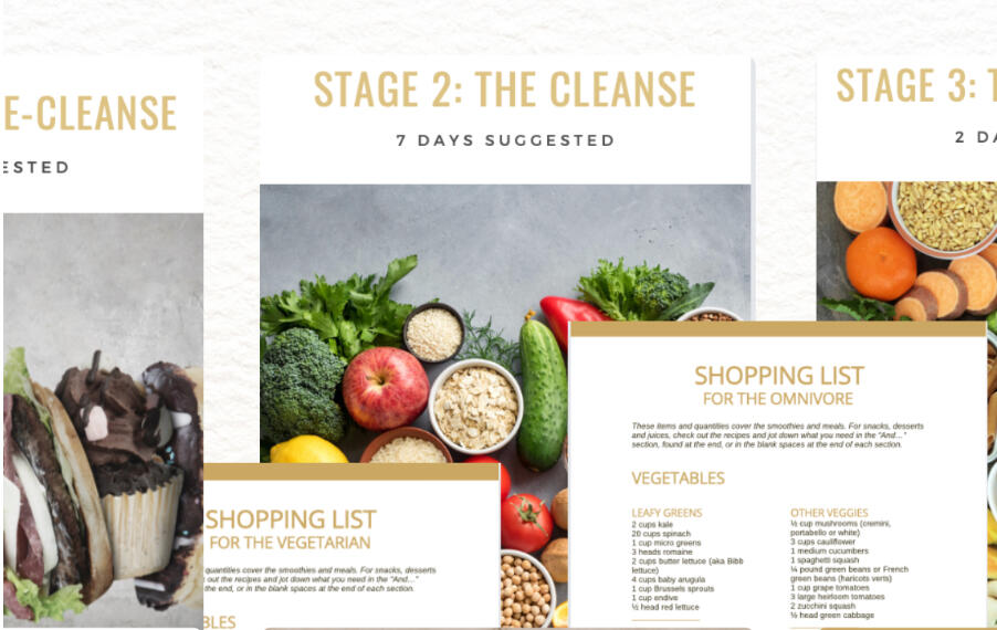 Shopping List: Convenient lists of suggested foods that correspond to the recipe guide and program manual for a cleanse-friendly shopping experience, with options for both vegetarian and omnivorous meals.